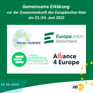 Vor der Tagung des Europäischen Rats am 23./24. Juni appellieren Pulse of Europe, Europa-Union Deutschland, JEF Deutschland und Alliance4Europe an die deutsche Bundesregierung, an ihren im Koalitionsvertrag festgeschrieben europapolitischen Zielen festzuhalten. Erklärtes Ziel der Bundesregierung war die Einberufung eines Europäischen Konvents mit dem Ziel, Vertragsreformen herbeizuführen, die geeignet sind, die Handlungsfähigkeit der Europäischen Union zu erhöhen und insbesondere die aus dem Einstimmigkeitsprinzip resultierenden… » weiterlesen