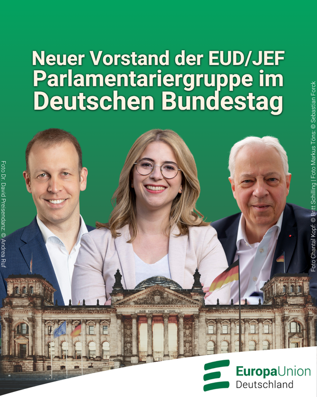 Die interfraktionelle Parlamentariergruppe ist ein Zusammenschluss von Bundestagsabgeordneten, die Mitglieder der Europa-Union Deutschland und ihres Jugendverbandes Junge Europäische Föderalist:innen (JEF) sind. Derzeit umfasst die EUD/JEF-Parlamentariergruppe über 120 Bundestagsabgeordnete. Die Parlamentariergruppe im Bundestag lädt regelmäßig zu Veranstaltungen mit europapolitischer Themensetzung ein, wie dem Parlamentarischen Europaforum in Kooperation mit der JEF Deutschland.