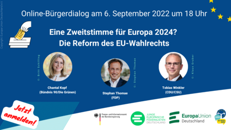Wir laden Sie am Dienstag, den 6. September 2022, von 18:00 bis 19:30 Uhr herzlich zu unserem Online-Bürgerdialog „Eine Zweitstimme für Europa 2024? Die Reform des EU-Wahlrechts“ ein. Bringen Sie Ihre Anliegen und Fragen ein und treten Sie in den virtuellen Dialog mit: